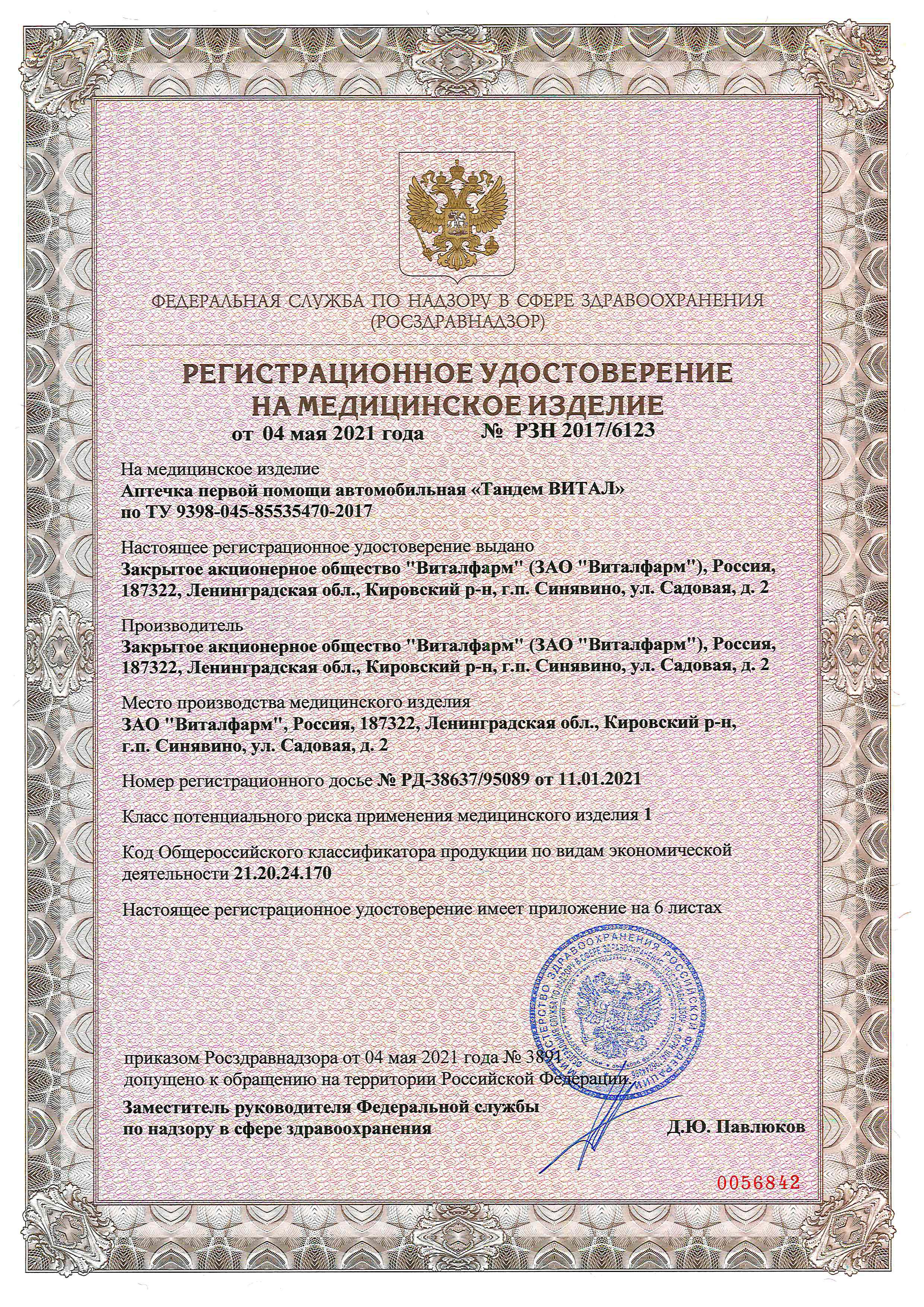 | РУ | РЗН 2017/6123 от 04.05.2021 |