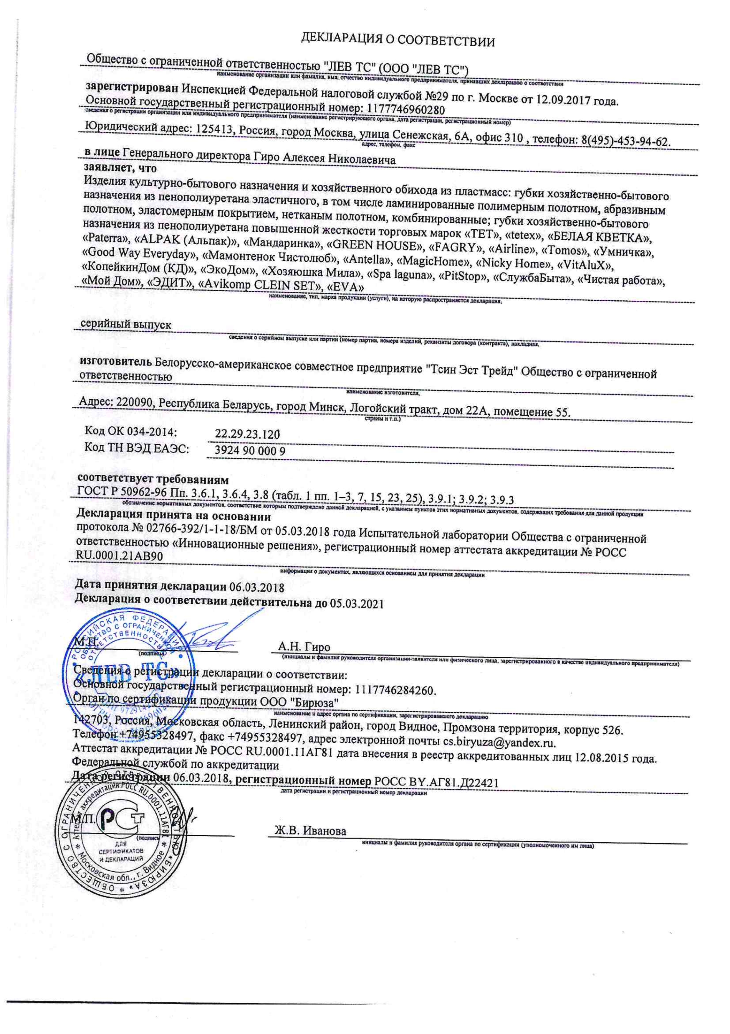 | Губка поролоновая | 1 шт |